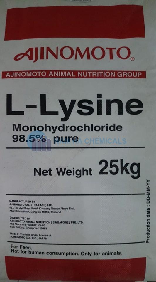 L-Lysine Monohydrochloride 98.5% có dạng bột màu nâu, có mùi đặc trưng và dễ tan trong nước. Lysine là một trong những acid amin được sử dụng rộng rãi nhất, là một acid amin thiết yếu cần thiết trong khẩu phần ăn của động vật, giúp cải thiện chuyển hóa protein, thúc đẩy quá trình tăng trưởng và cải thiện khả năng chống bệnh tật.