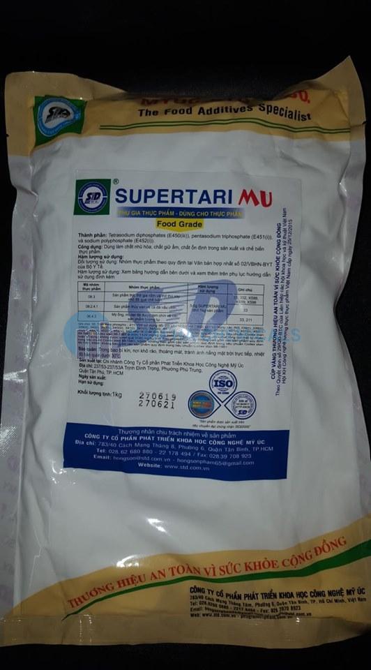- Công dụng: SuperTari MU tạo độ giòn dài cho các sản phẩm thịt, cá, rau, quả. Ổn định độ pH, hạn chế sự phát triển của vi sinh vật, giữ màu sắc và mùi vị sản phẩm được tươi hơn, có khả năng giữ nước giúp tăng tỉ trọng sản phẩm.